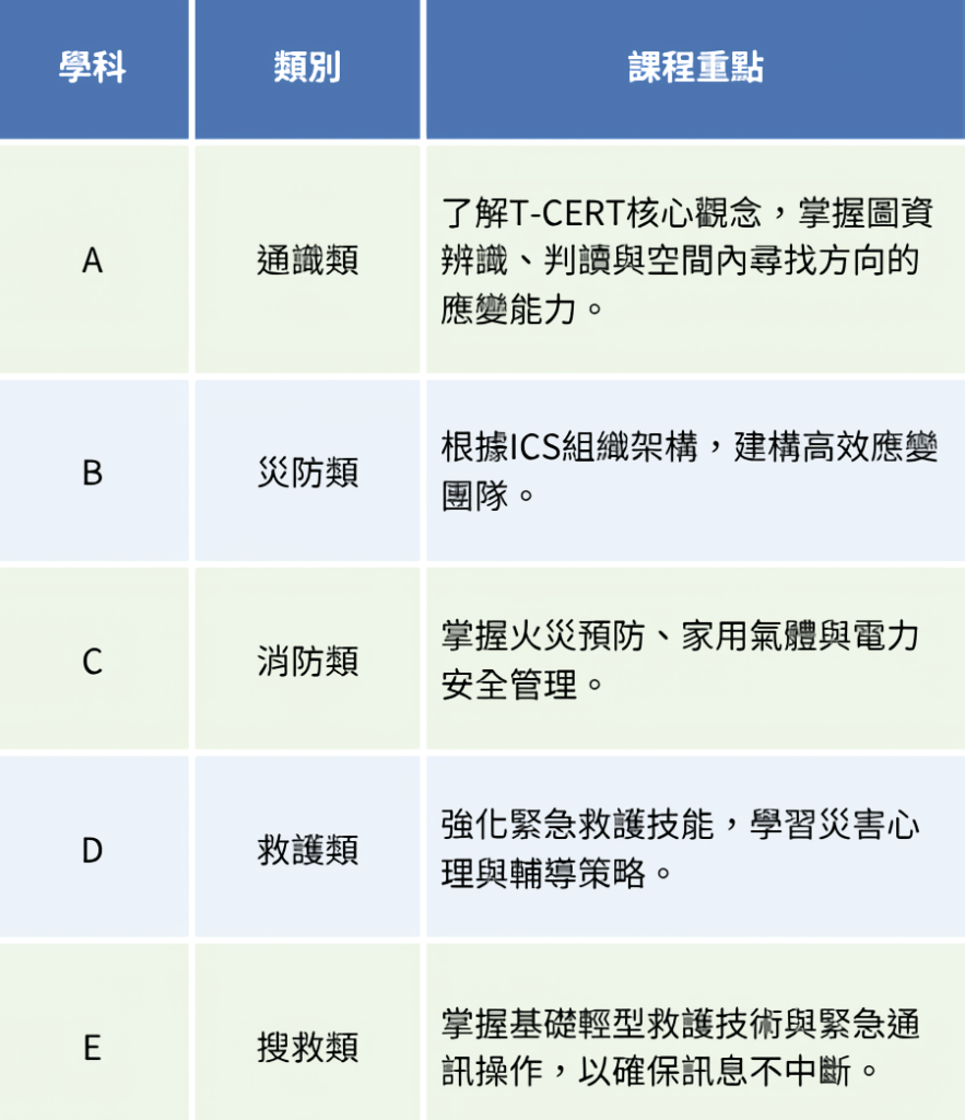 表二、T-CERT基礎培訓課程學科分類表