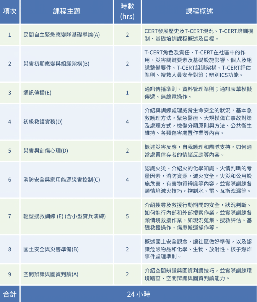 表一、T-CERT基礎培訓課程初步規劃