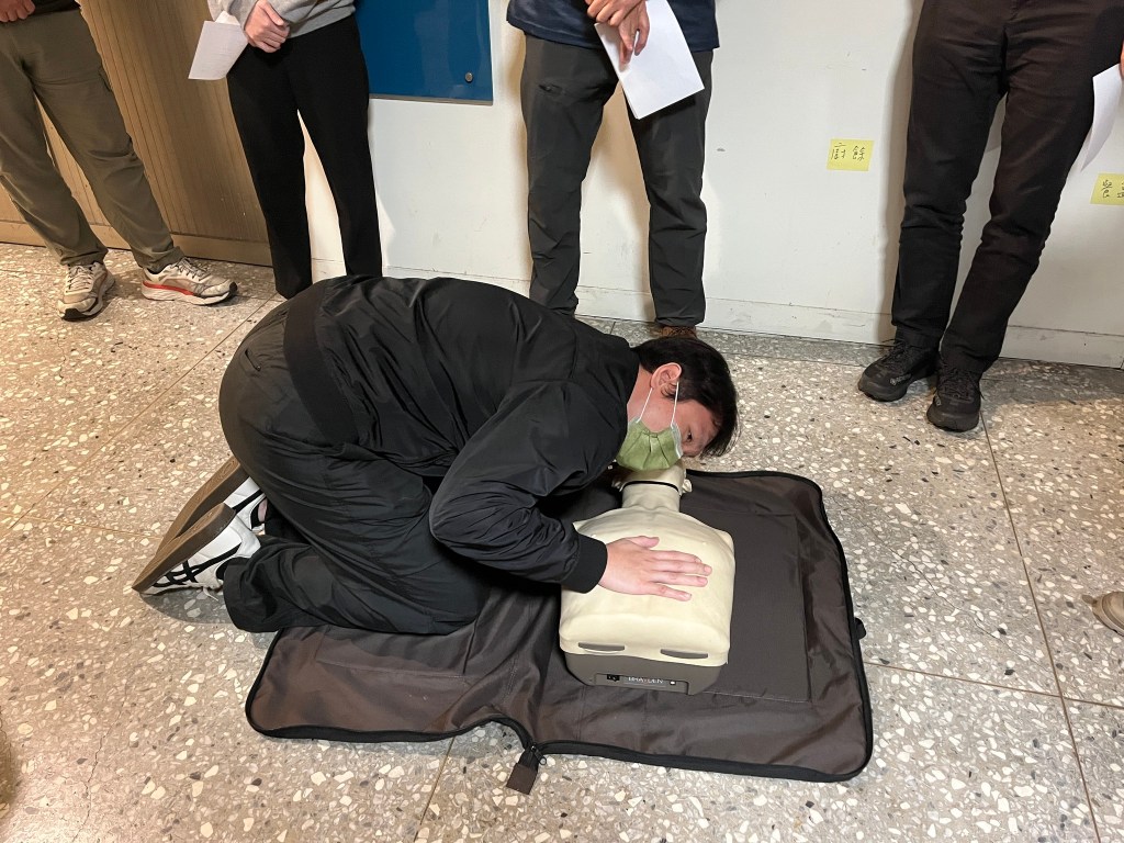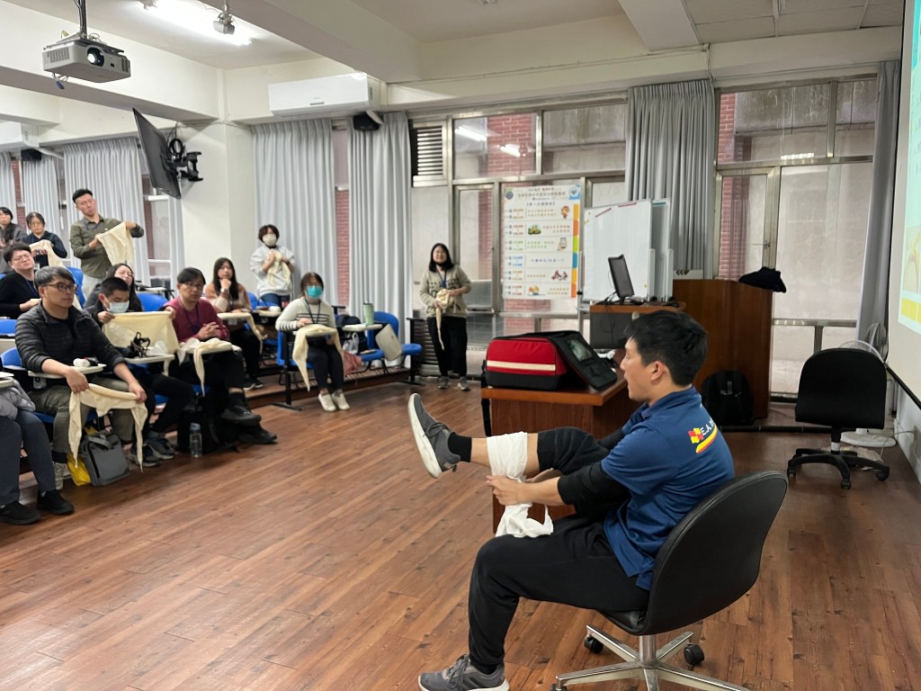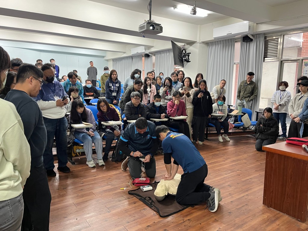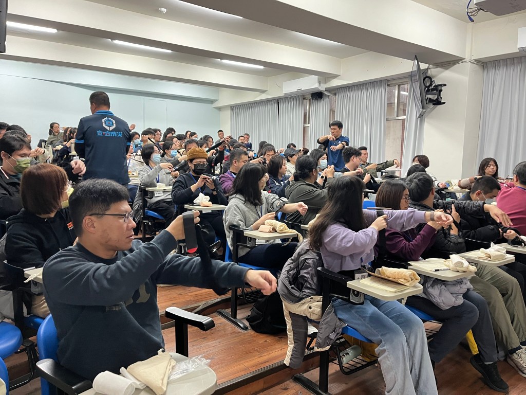 首日課程,安排了基礎急救訓練、急救措施實作(包括CPR/AED、哈姆立克異物排除、止血帶、止血包紮、傷患搬運)、防災士職責與任務、我國災防體系與運作、我國近年災害經驗及災害特性、資訊掌握、運用與社區防災計畫等課目;透過經驗豐富的講師及教官團隊的講述及引導,學員們無不認真聆聽學習並且透過交流分享經驗及想法,務實地操作練習各項急救實作項目,從中思考並領悟各種災害情境下應建立的應變作為,以及災前可以規劃的防減災行動及準備事項。