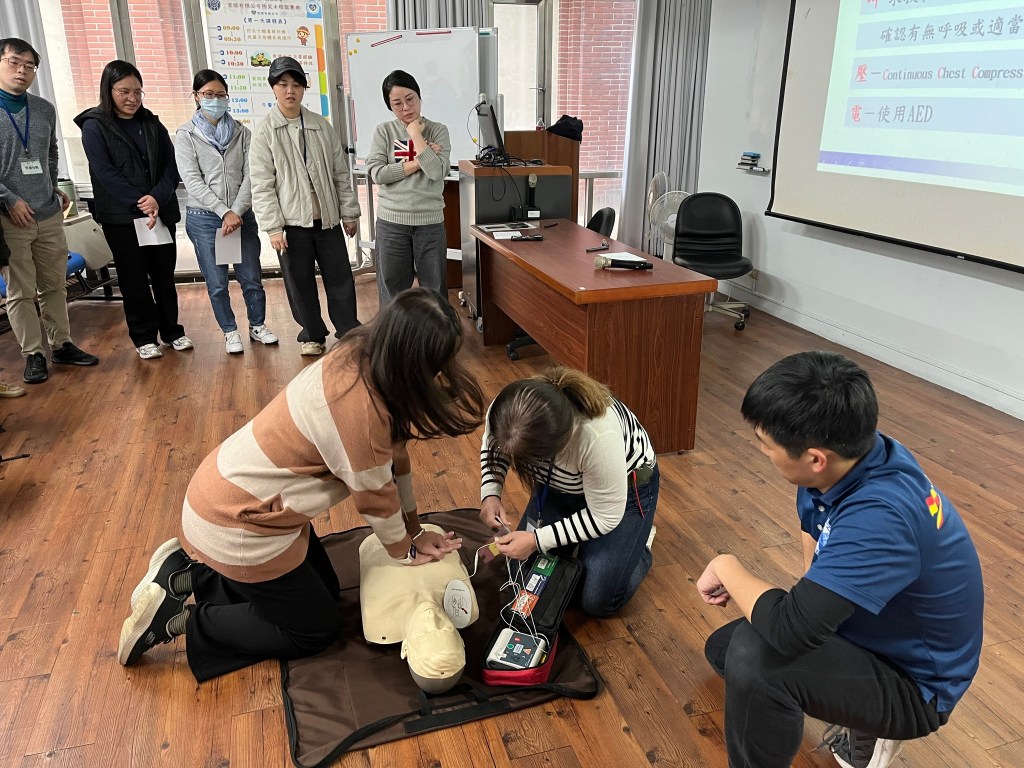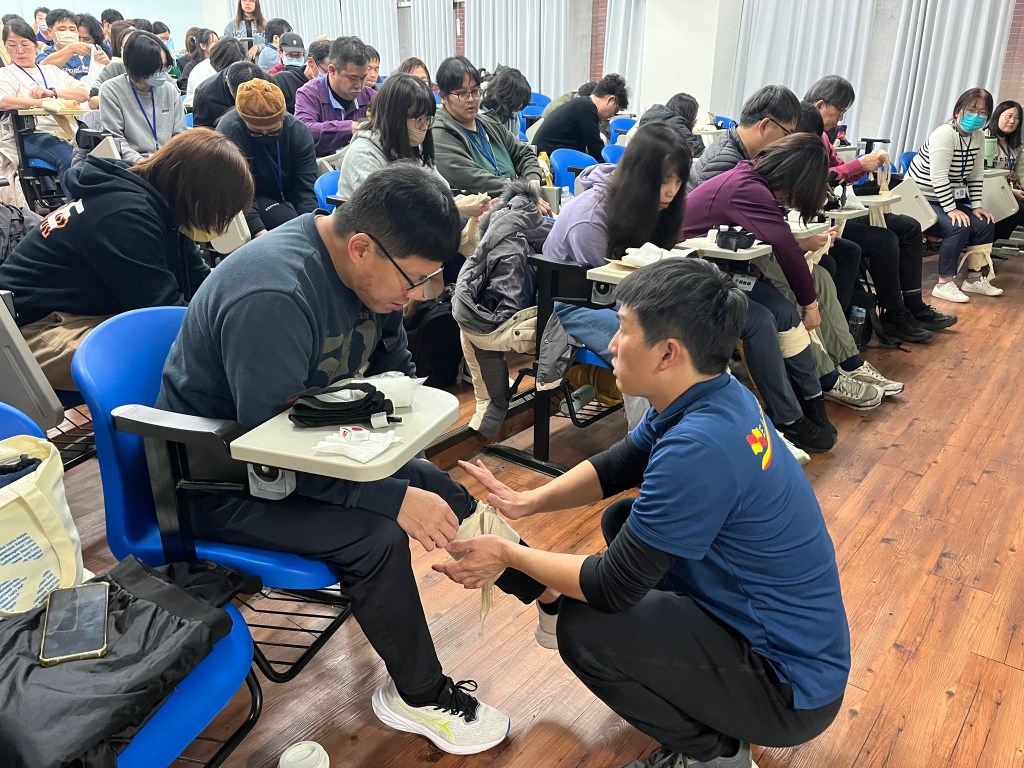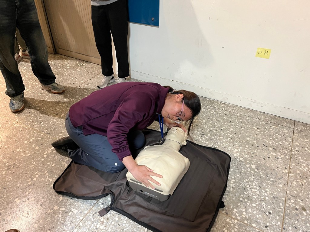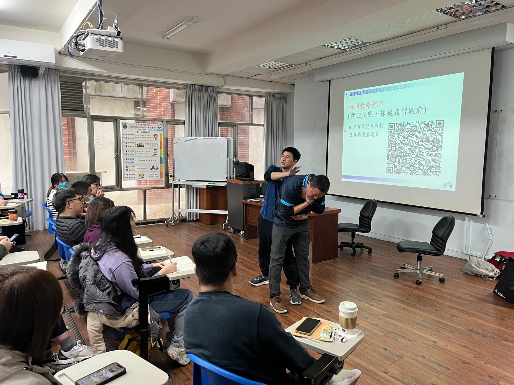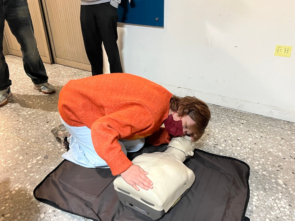 首日課程,安排了基礎急救訓練、急救措施實作(包括CPR/AED、哈姆立克異物排除、止血帶、止血包紮、傷患搬運)、防災士職責與任務、我國災防體系與運作、我國近年災害經驗及災害特性、資訊掌握、運用與社區防災計畫等課目;透過經驗豐富的講師及教官團隊的講述及引導,學員們無不認真聆聽學習並且透過交流分享經驗及想法,務實地操作練習各項急救實作項目,從中思考並領悟各種災害情境下應建立的應變作為,以及災前可以規劃的防減災行動及準備事項。